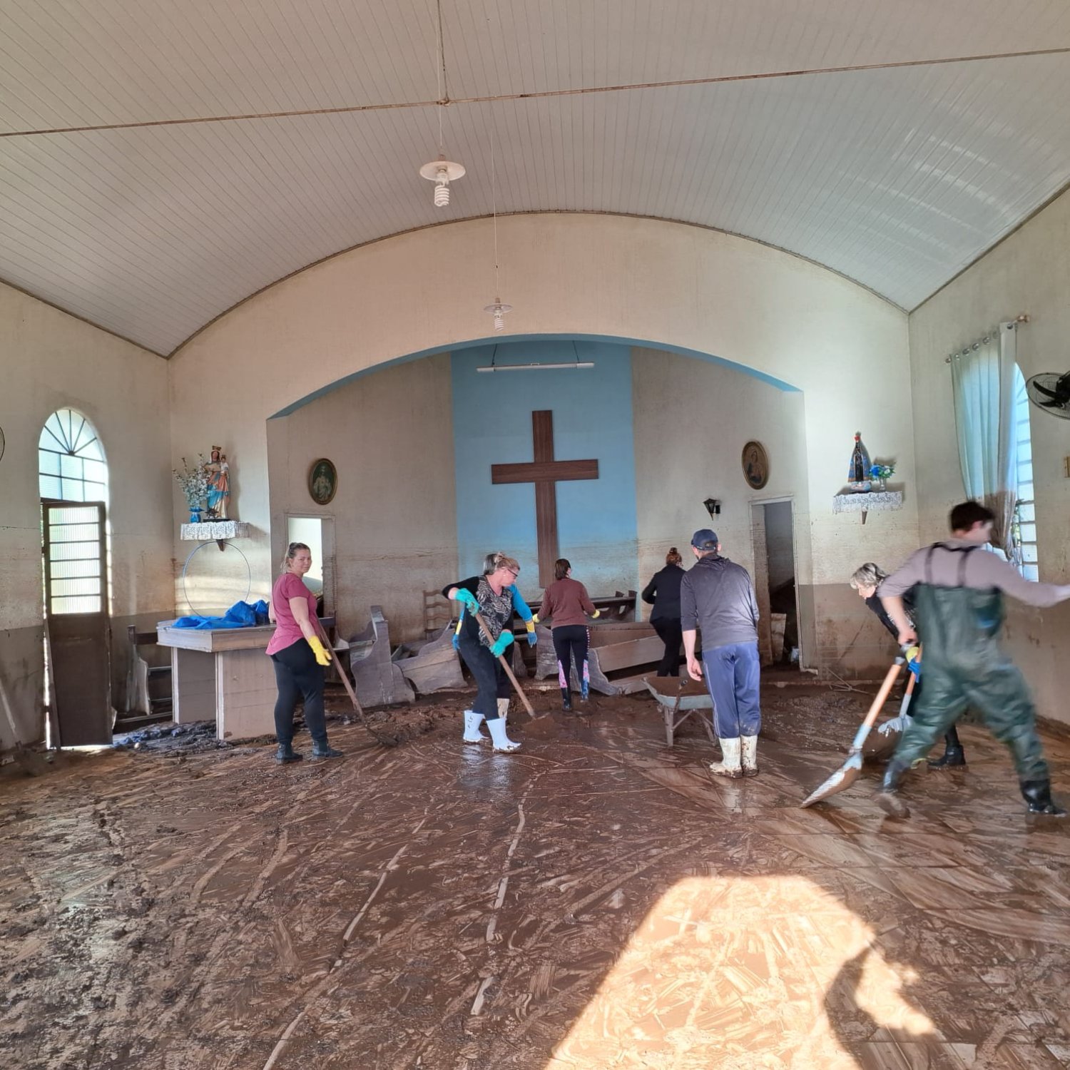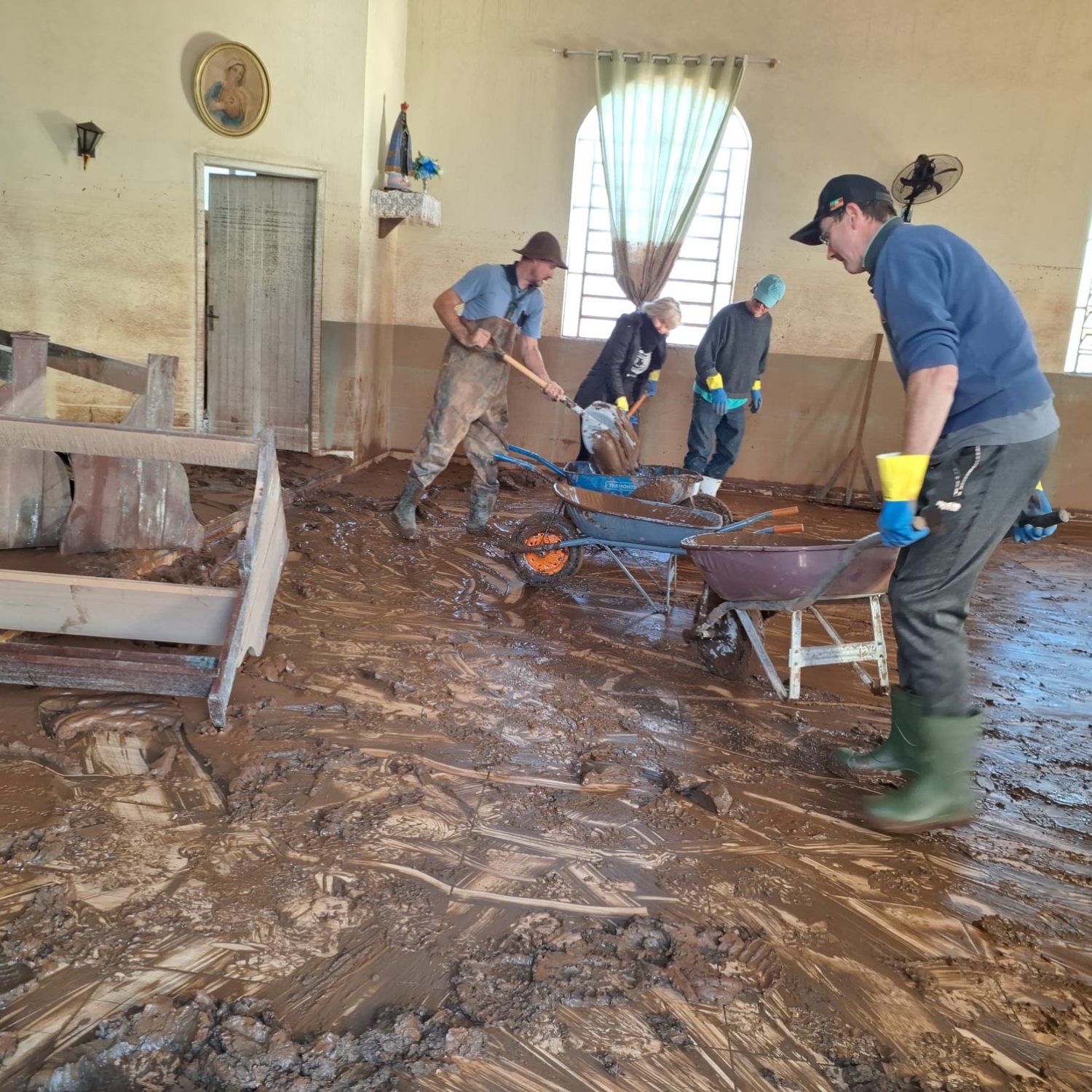 tudo que encontrava no caminho. Fomos limpar a igreja e o salão porque lá não mora mais ninguém e os poucos tem que limpar o que é deles. Nesta mesma vila 50 casas, galpões, tratores e árvores foram levados pelo rio. Todos estes entulhos estão depositados no fundo dos rios ou em lugares baixos", destacou José Renner, um dos voluntários.