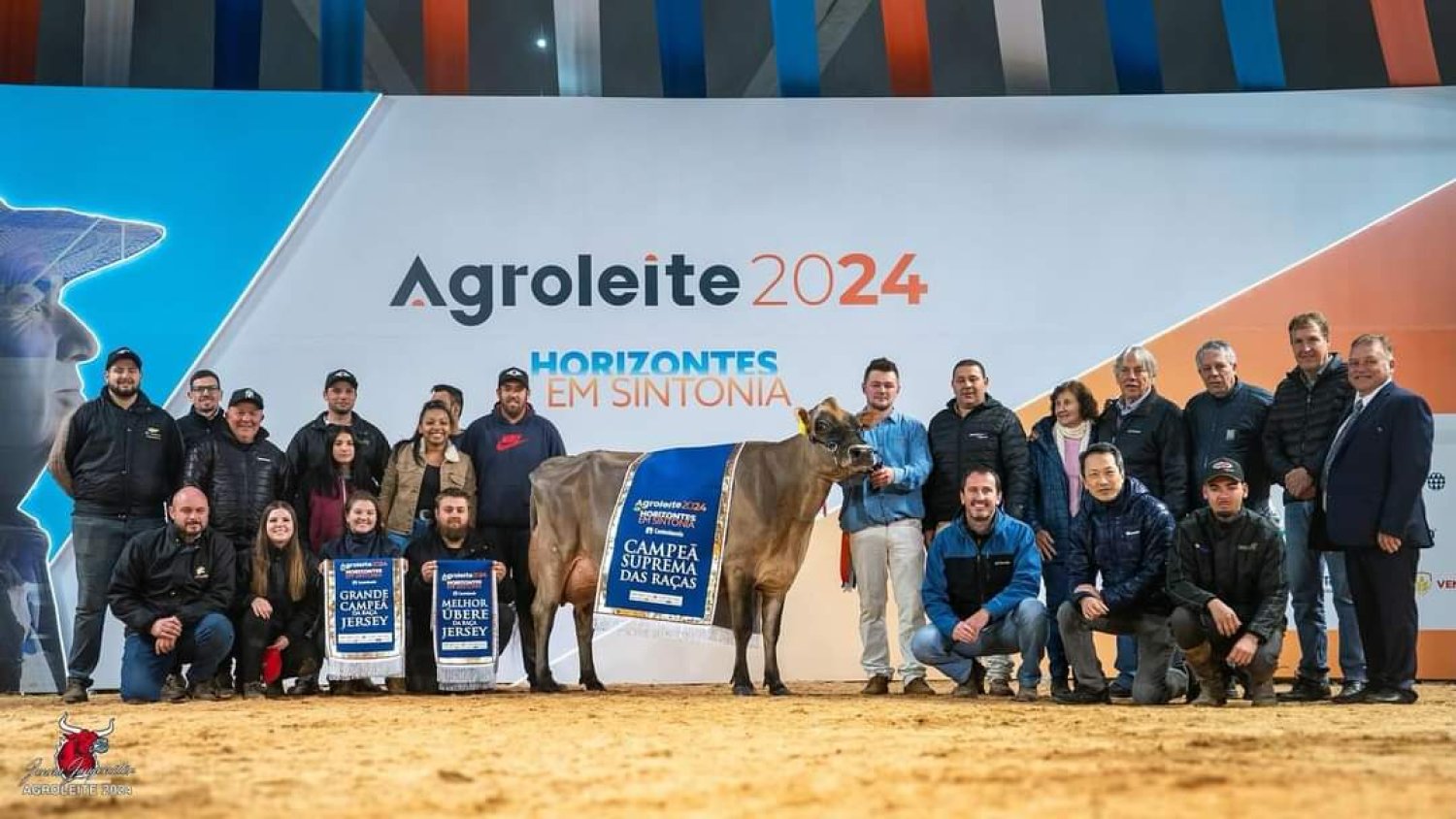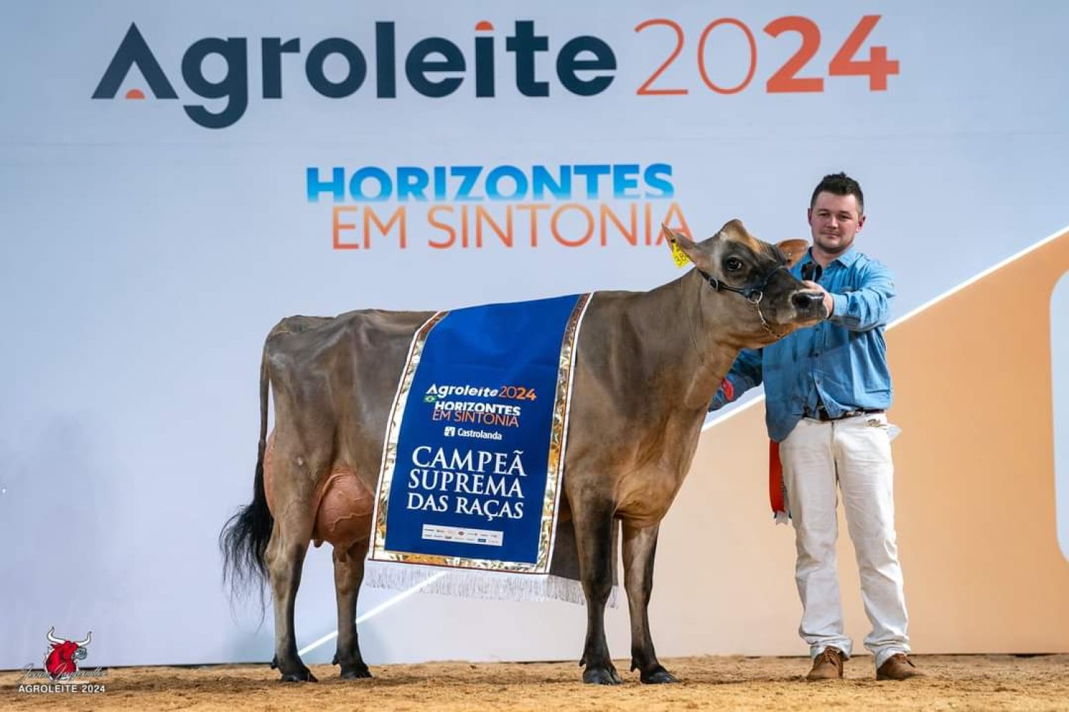 A Campeã Suprema das Raças, melhor animal do Agroleite 2024- Horizontes em Sintonia, foi a vaca Nanda Celebrity Avistoso, do expositor Carlos Jacob Wallauer de Salvador do Sul-RS. Com um currículo impressionante de conquistas, Nanda já havia sido premiada como Campeã Vaca Adulta e Melhor Úbere na Expointer 2021, Campeã Vaca Longeva e Melhor Úbere na Fenasul 2022, Reservada Grande Campeã Jersey em 2022, Reservada Vaca Longeva na Expoagro Cotricampo 2023, e Reservada Vaca Longeva na Fenasul 2023.