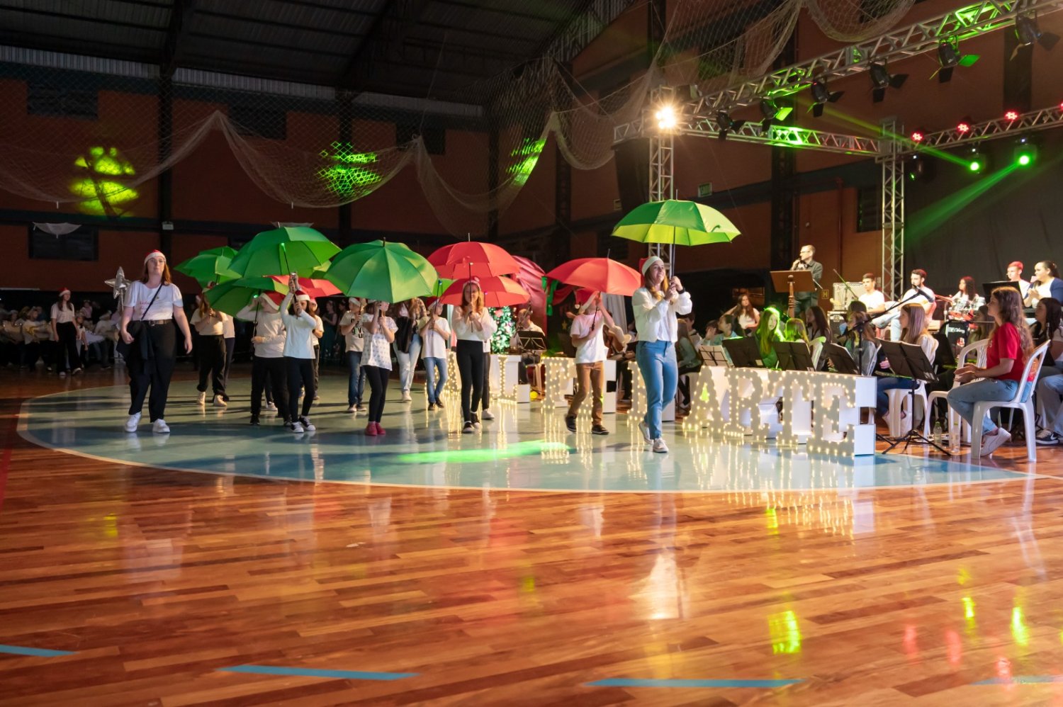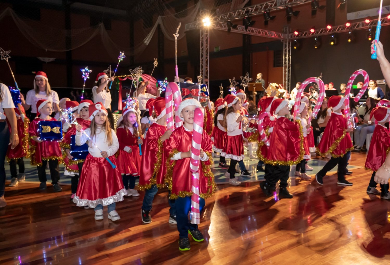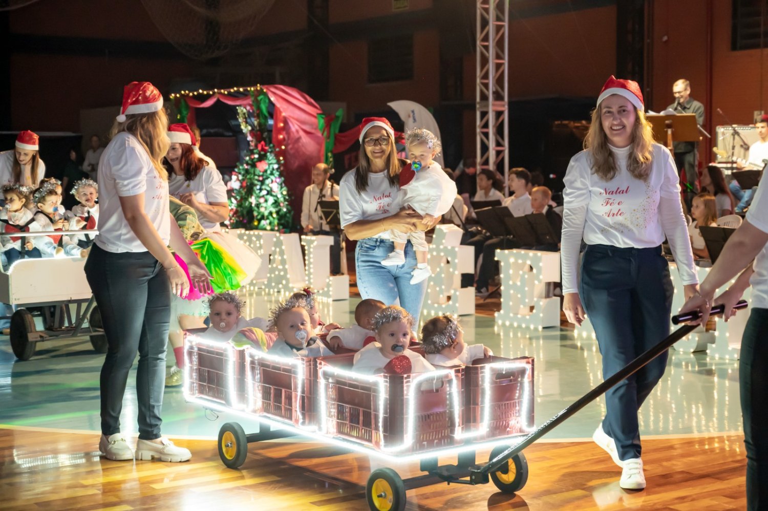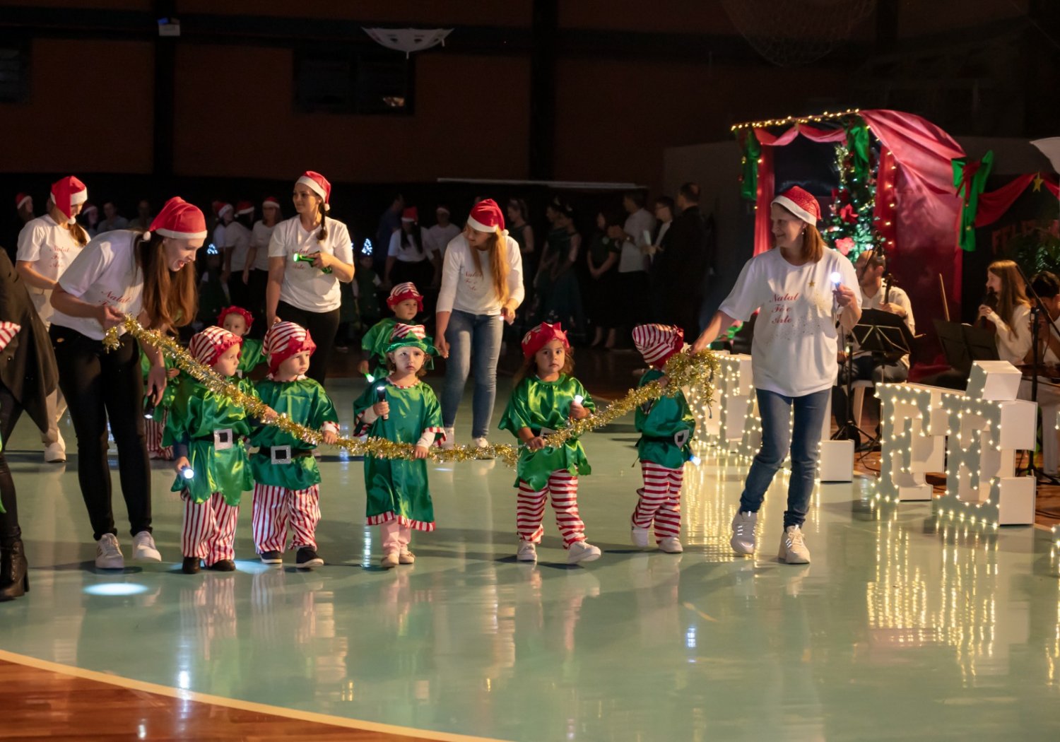 Nem a instabilidade do tempo atrapalhou a realização da sexta edição do Natal Fé e Arte, em São Pedro da Serra. Luzes, sorrisos e lágrimas de emoção tomaram o ginásio municipal com as apresentações das escolas, entidades e comunidade são-pedrense. Crianças e adultos vibraram com o desfile de bailarinas, artistas, banda, personagens e o Papai Noel. Aos poucos, o espetáculo foi ganhando corpo. Centenas de pessoas assumiram seus lugares, em alas intercaladas com muitos símbolos natalinos.