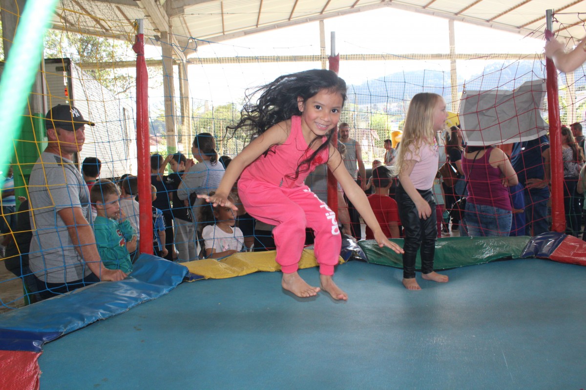 Logo após, as crianças receberam fichas para curtir os brinquedos infláveis, disponibilizados no pavilhão aberto.