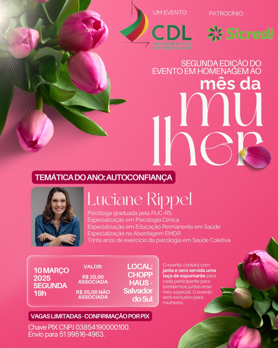 Em comemoração ao Dia Internacional da Mulher, o CDL Salvador do Sul e São Pedro da Serra realizará um evento especial no dia 10 de março, às 19h, na Chopp Haus. O objetivo da noite é proporcionar um momento de descontração e conexão para as mulheres da região, com foco em temas como autoconfiança.
