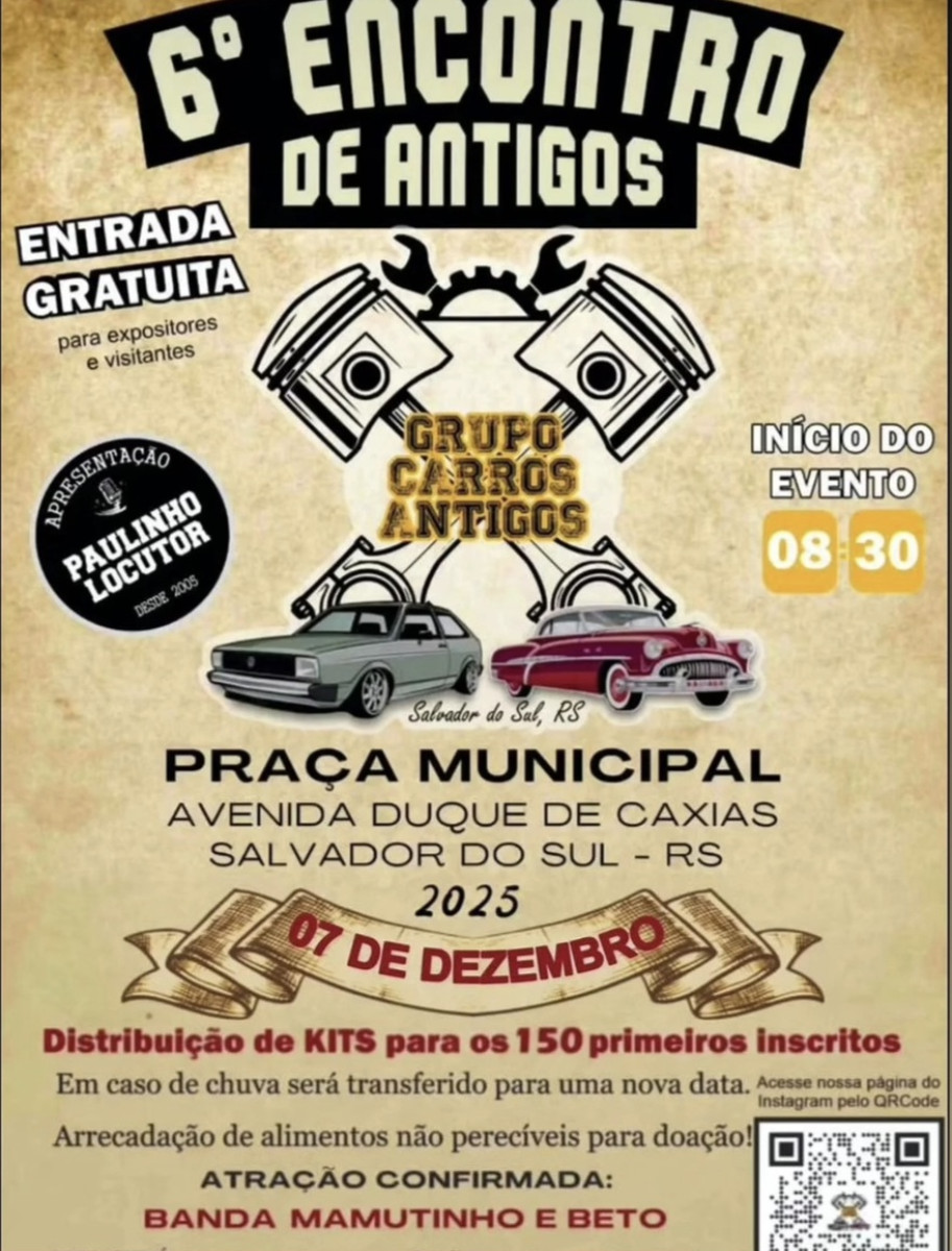 O final de semana está prestes a ficar mais nostálgico e vibrante! A Praça Municipal de Salvador do Sul - RS será palco do aguardado 6º Encontro de Carros Antigos, um evento imperdível para amantes de veículos clássicos, expositores e toda a comunidade.