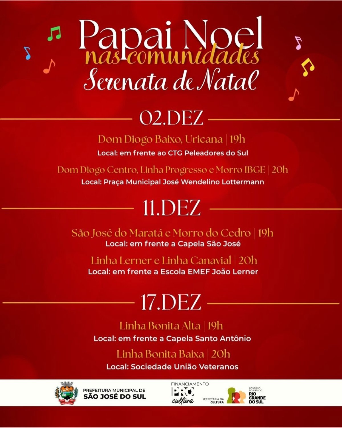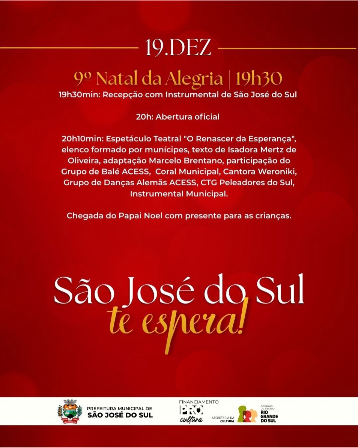 A Prefeitura Municipal de São José do Sul, com o financiamento do Pró-Cultura e Governo do Estado do Rio Grande do Sul, preparou uma vasta e emocionante programação para as celebrações de Natal deste ano. Os eventos, que se estendem por todo o mês de dezembro, prometem envolver toda a comunidade com espetáculos teatrais, apresentações musicais, caminhadas luminosas e a tradicional chegada do Papai Noel.