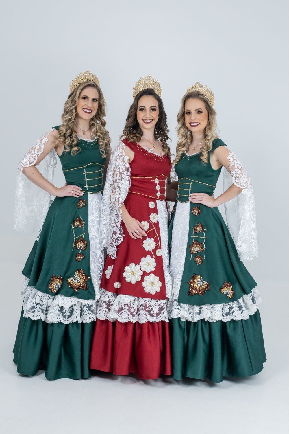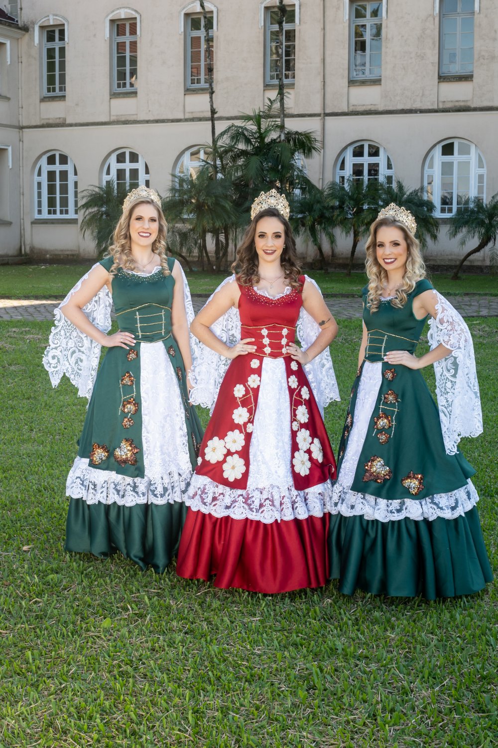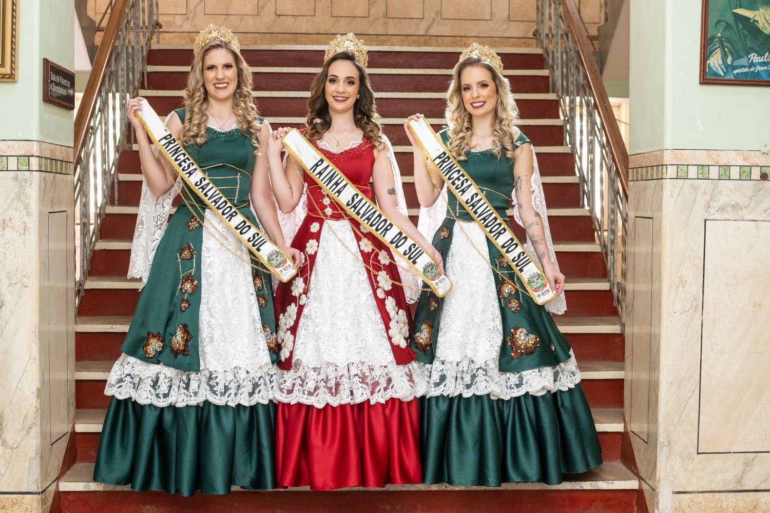 Os trajes tem as cores da bandeira salvadorense, verde e vermelho, uma referência aos 60 anos de sua emancipação comemorados este ano. O vestido da rainha é composto por bordados em margarida, flor símbolo, que fica ainda mais reluzente sobre o tom vermelho carmim, fazendo com que a renda se sobressaia sutilmente nas mangas e na parte frontal do vestido. Já nas princesas destacam-se os tons de verde escuro ressaltando a grandiosidade da mata nativa, composta por bordados em pedraria de folhas de plátano, árvore facilmente encontrada em nosso município. ‘Em nossos vestidos ainda é possível ver os bordados de trilhos de trem, inspiração que veio através do crescimento e desenvolvimento da nossa cidade, quando em meados do ano de 1910 o trem começou a passar por ela. Mas essa composição belíssima só foi possível com a junção da nossa nova coroa que vem composta por muito brilho e um designer único. Sua confecção foi desenvolvida pela estilista Adriana Menezes, na qual ressaltou nas coroas e acessórios a elegância aliada a delicadeza e conforto’, destacaram as soberanas de Salvador do Sul. ‘Para nos representar Salvador do Sul, é uma honra e um sonho que se torna realidade a partir deste momento’, destacaram no discurso.