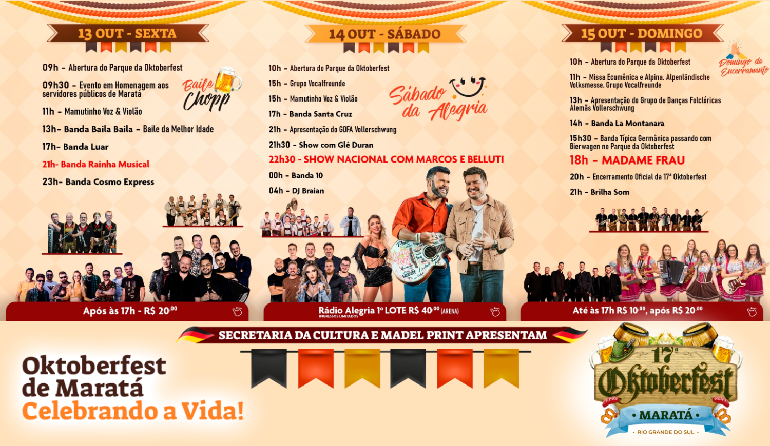 A partir do dia 12, feriado nacional, a Oktoberfest segue em Maratá. Para o final de semana, além da programação com muito baile, apresentações culturais terá o show nacional com a dupla sertaneja Marcos e Belutti, no sábado. Acompanhe a programação: