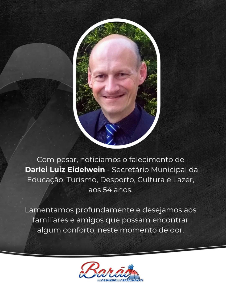 Flaeceu neste domingo, 24 de dezembro, Darlei Luiz Eidelwein, atual Secretário Municipal da Educação, Turismo, Desporto, Cultura e Lazer do município de Barão, aos 54 anos.