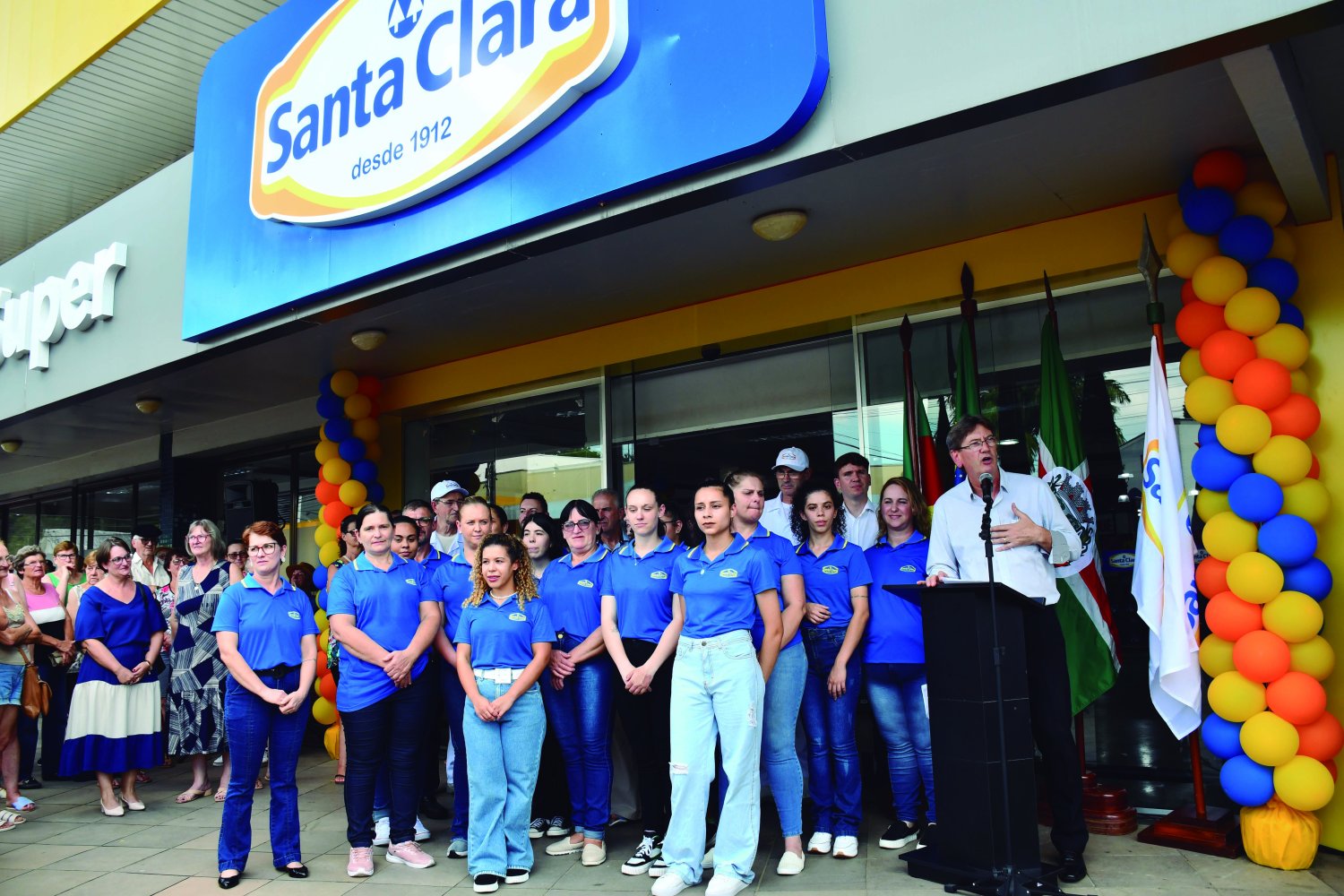 A supervisora do Supermercado Santa Clara de Salvador do Sul, Marciane Matte Kunzler, pronunciou-se e emocionada agradeceu à equipe de colaboradores e a Cooperativa Santa Clara pela acolhida, lembrando do grande trabalho realizado para colocar mais de 3 mil itens da nova unidade à disposição dos clientes. O diretor Administrativo e Financeiro da Cooperativa, Alexandre Guerra, também falou aos presentes destacando a importância da fusão de um negócio de família, do antigo grupo Solar, passar para a Cooperativa Santa Clara, que ‘se orgulha de ser feito de pessoas para pessoas’. Na oportunidade, chamou todos os colaboradores do novo supermercado salvadorense à frente para que a comunidade conheça a equipe que atenderá no município e ressaltar o trabalho realizado. O presidente da Santa Clara, Gelsi Belmiro Thums, agradeceu a todos os presentes e também ressaltou a presença do conselho e também dos funcionários de diversas unidades que vieram prestigiar a inauguração. Por fim, o prefeito de Salvador do Sul, Marco Aurélio Eckert ressaltou o crescimento do município e a presença do comércio forte no município, motivo de orgulho para ele como gestor. ‘Somos gratos à família do Grupo Solar, na pessoa da matriarca Ieda, pelo trabalho de 58 anos da Solar em nossa cidade. E recebemos a Cooperativa Santa Clara de braços abertos para que façam ótimos negócios e atendam muito bem nossas famílias, que é a marca da empresa’, destacou o prefeito.